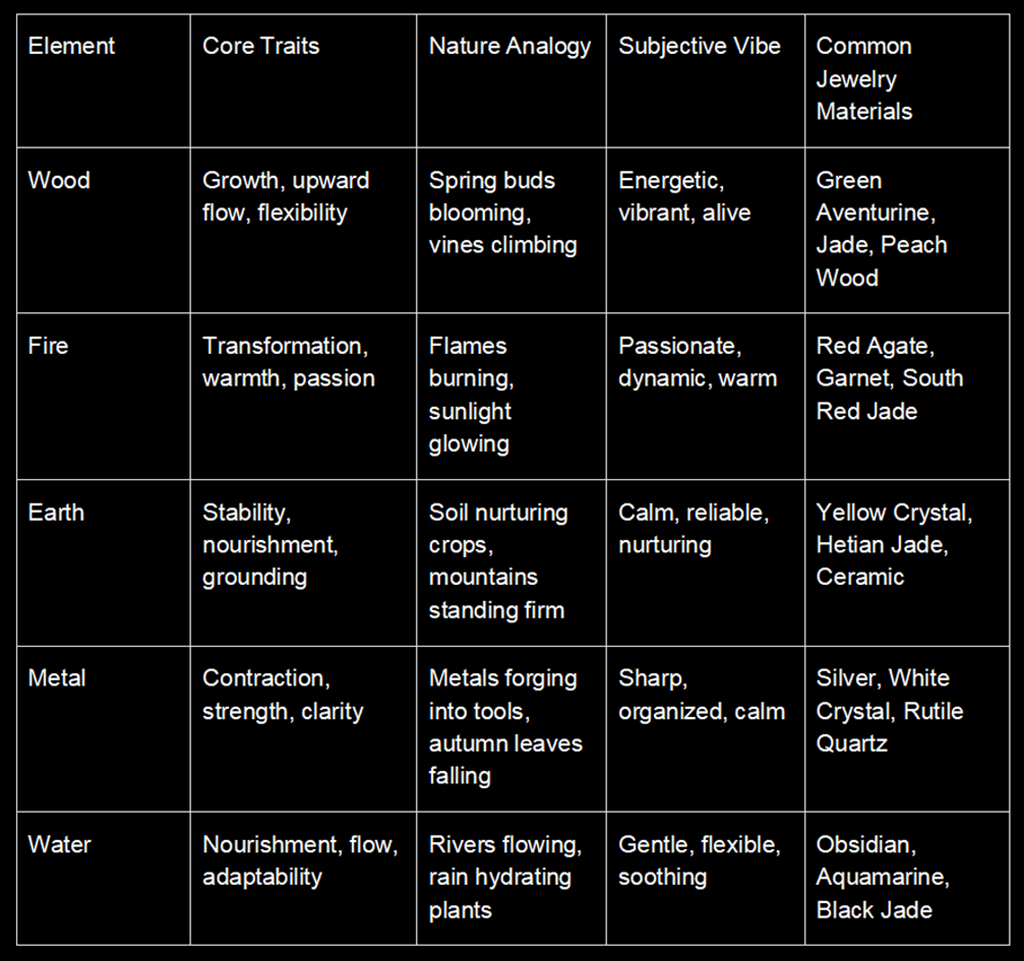 This cycle mirrors the seasons: Spring (Wood) warms into Summer (Fire), Summer fades into harvest (Earth), Autumn (Metal) cools into Winter (Water), and Winter’s rain feeds next Spring’s Wood. For you, this means if you’re low on Fire energy, you might first boost Wood (since Wood feeds Fire)—a logic we use for jewelry pairing.