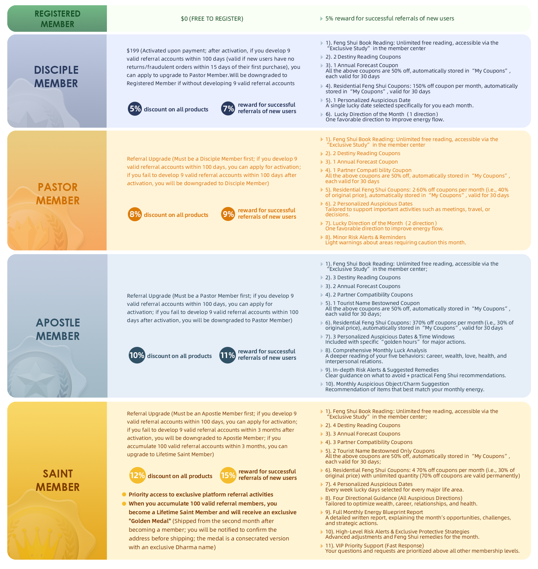 Disciple Member | $199 (Activated upon payment; after activation, if you develop 9 valid referral accounts within 100 days (valid if new users have no returns/fraudulent orders within 15 days of their first purchase), you can apply to upgrade to Pastor Member.Will be downgraded to Registered Member if without developing 9 valid referral accounts | 1). 5% discount on all products; 2). 7% reward for successful referrals of new users | 1). Feng Shui Book Reading: Unlimited free reading, accessible via the “Exclusive Study” in the member center; 2). 2 Destiny Reading Coupons 3). 1 Annual Forecast Coupon All the above coupons are 50% off, automatically stored in “My Coupons”, each valid for 30 days; 4). Residential Feng Shui Coupons: 1 50% off coupon per month, automatically stored in “My Coupons”, valid for 30 days |