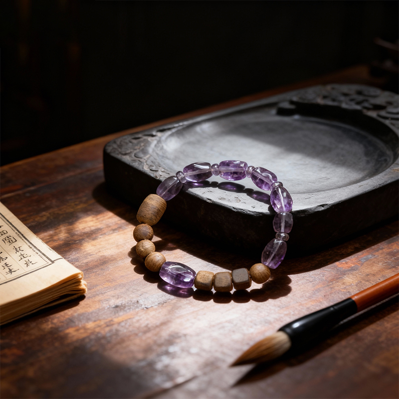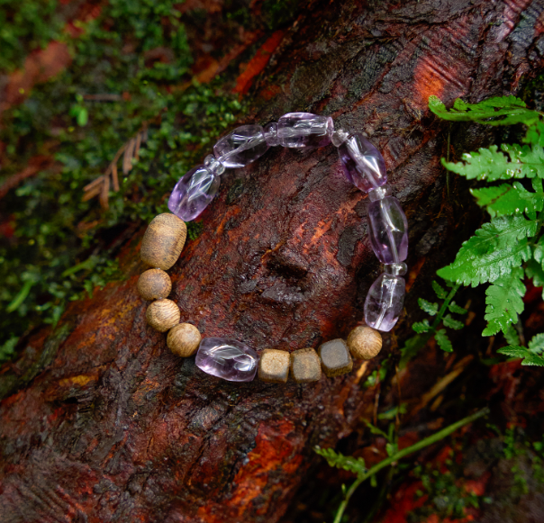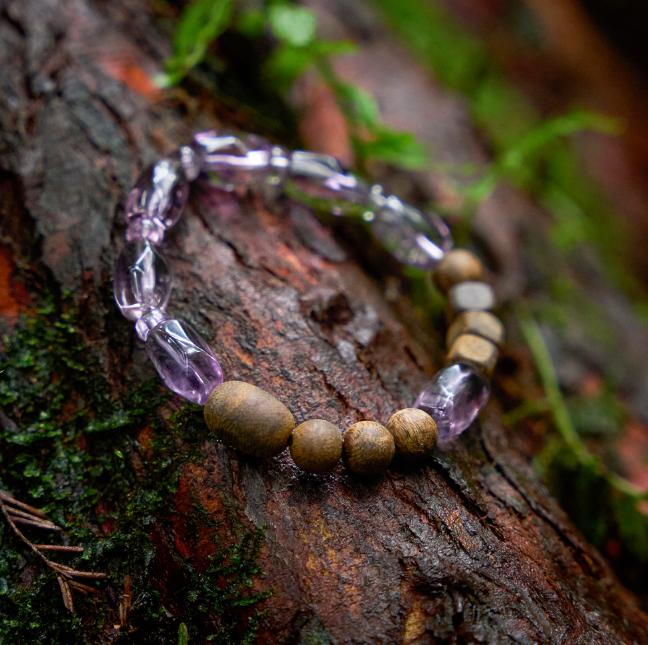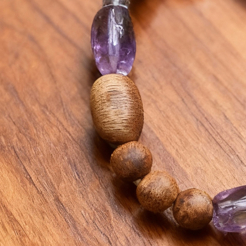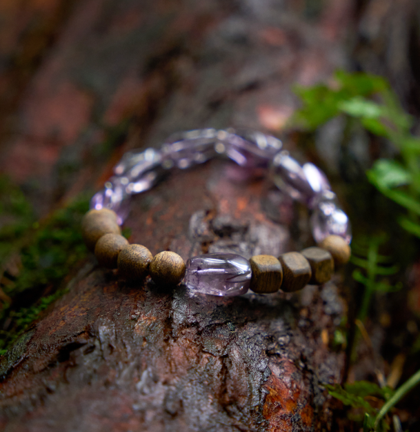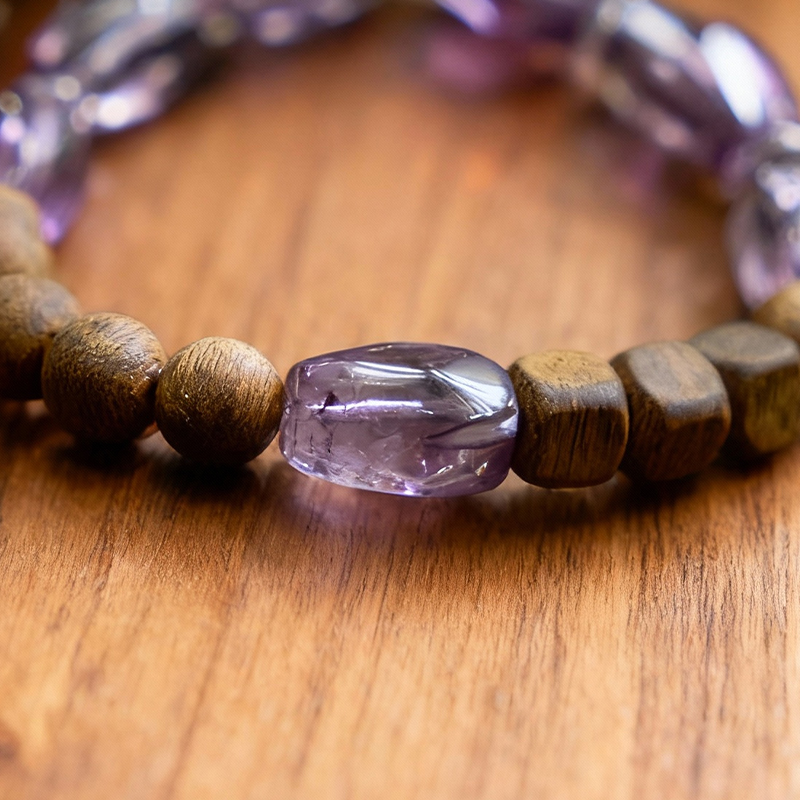 Crafted with amethyst and wood beads, this bracelet features a deep purple hue and natural textures. Amethyst, with its rich color and inherent energy, pairs harmoniously with the earthy tones of wood beads. Amethyst symbolizes wisdom, intuition, and spiritual growth, while wood beads add a grounding, natural element. It combines these elements to bring the wearer blessings of enhanced wisdom, boosted confidence, and the support of positive energies in life’s journey.