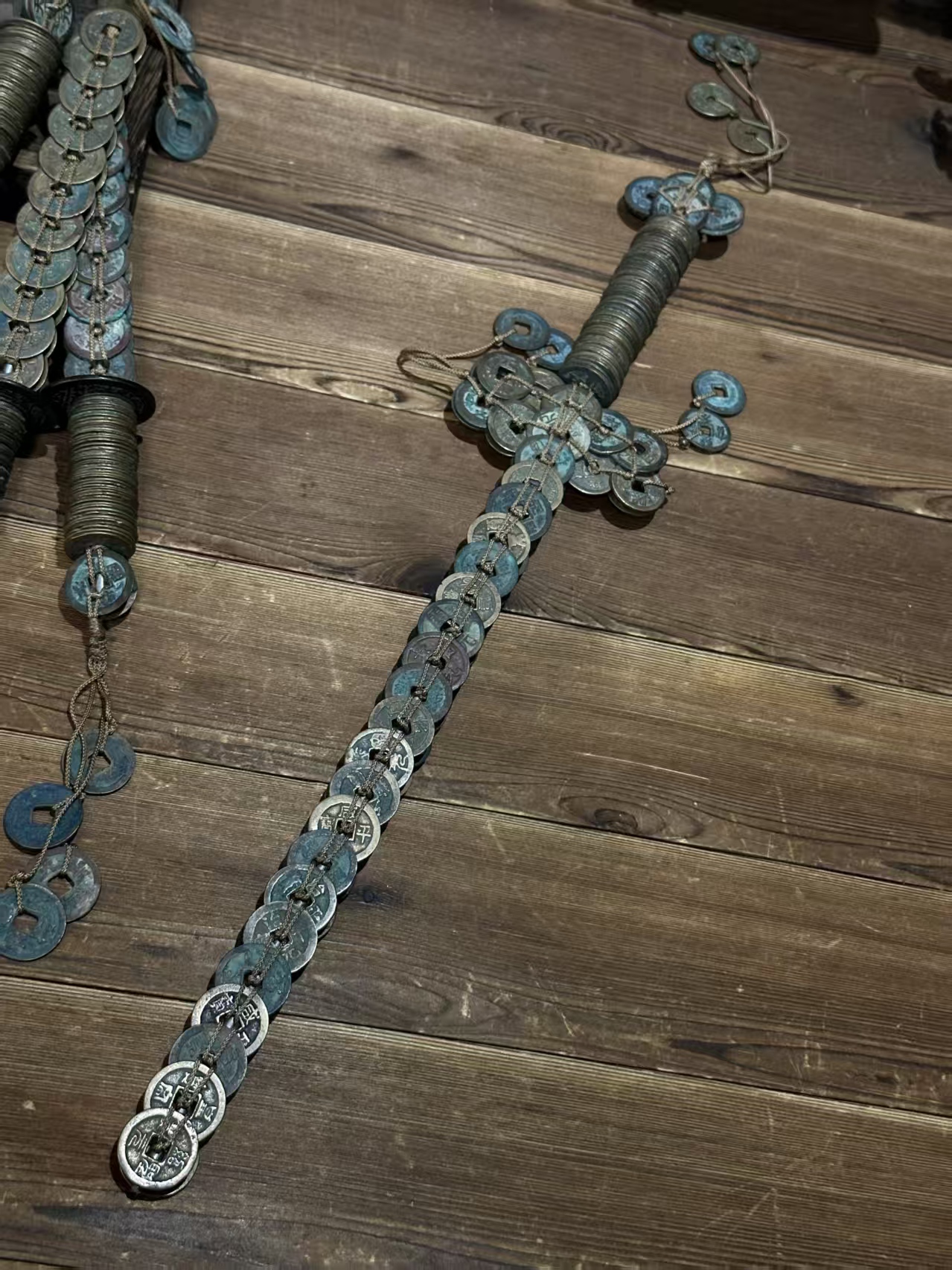 In terms of specifications, it is composed of about 150 ancient copper coins from successive dynasties, with an overall length of approximately 20 inches and a total weight of around 1.54 pounds. Crafted into a sword shape with ingenuity, each copper coin inherently bears the philosophical implication of “the sky is round and the earth is square”, and is endowed with wishes of attracting wealth and warding off evil spirits. As a weapon, the sword is a symbol of protecting the residence and dispelling evil in folk customs. The combination of the two makes the copper coin sword a folk utensil with the dual meanings of “attracting wealth and bringing blessings” and “suppressing evil and resolving misfortune”.