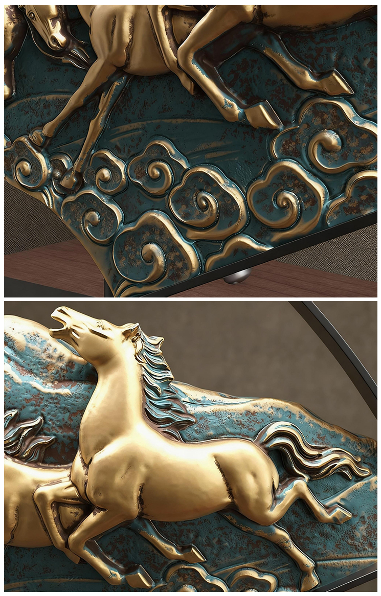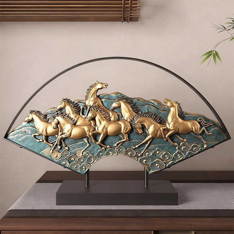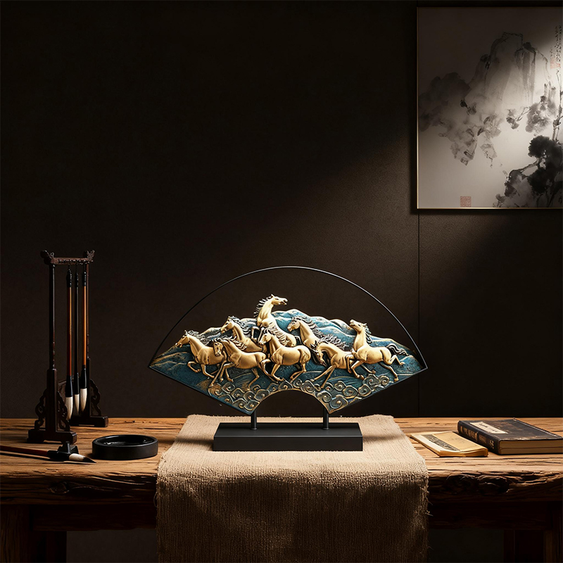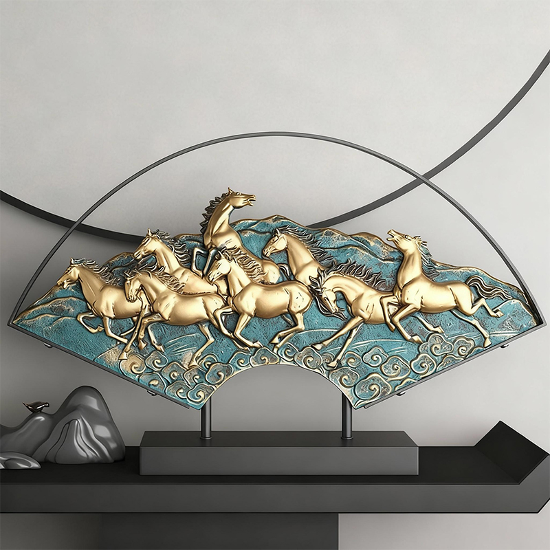 Crafted from resin and metal, this ornament features a dynamic design of eight galloping horses on a fan-shaped base. In feng shui, horses symbolize "immediate success in career" and forward momentum, attracting career advancements and bold pursuits. The intricate craftsmanship—from the horses’ lifelike details to the cloud patterns—reflects artistic excellence.