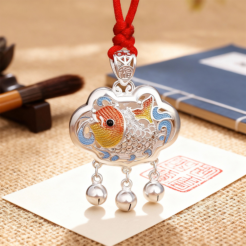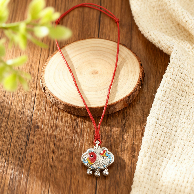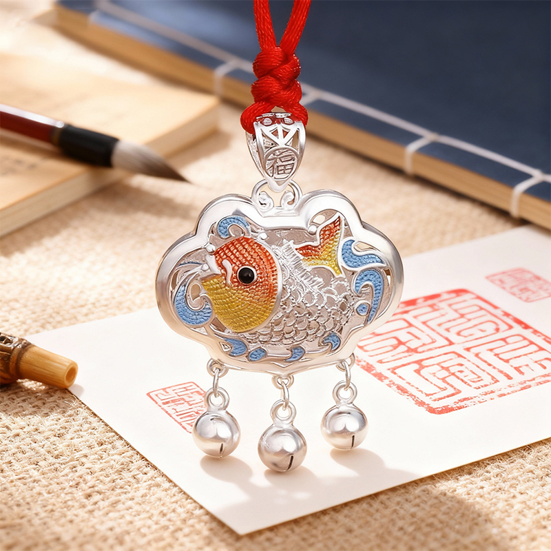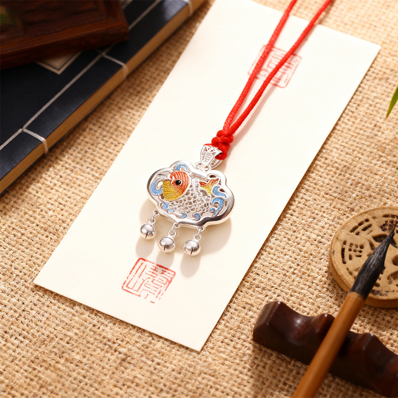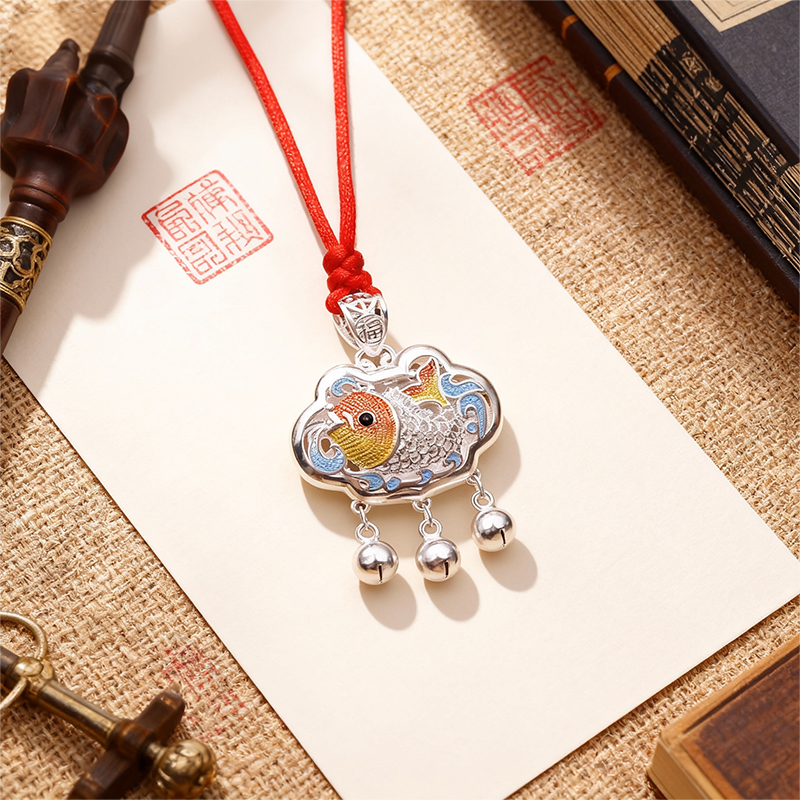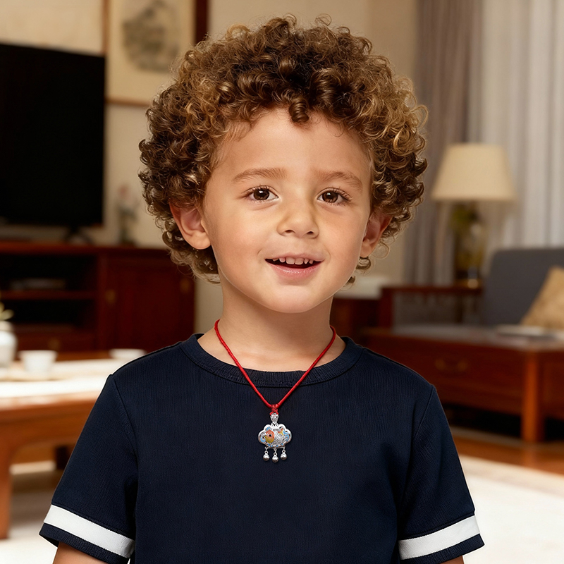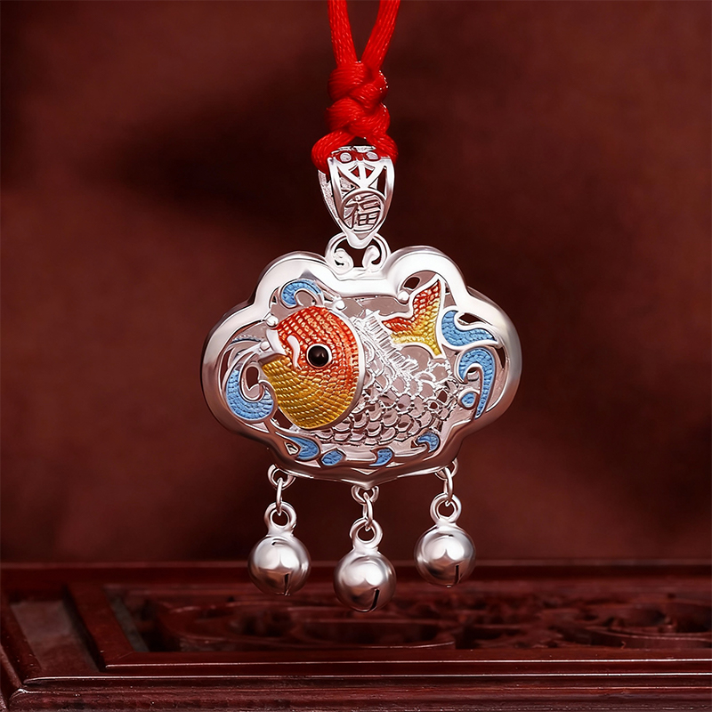 Crafted from premium fine silver, this baby pendant features an intricately designed longevity lock with a koi fish motif. The longevity lock symbolizes blessings for a long and prosperous life in traditional culture, while the koi fish represents ambition, success, and good fortune. Exceptional hollow-out craftsmanship and vibrant enamel details showcase remarkable artistry, and the red cord signifies protection and good luck. This pendant is a meaningful gift for newborns and infants, carrying profound cultural significance and heartfelt wishes for the baby's bright future.