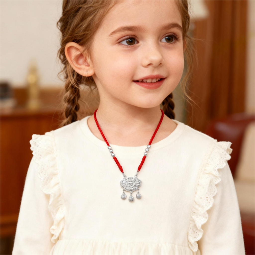 Crafted from fine silver, this baby pendant features a longevity lock adorned with koi fish and lotus motifs. The longevity lock symbolizes traditional wishes for a long, healthy, and peaceful life, while the koi fish represents good fortune and success, and the lotus embodies purity and auspiciousness. Exquisite sandblasted and polished craftsmanship showcases remarkable artistry, and the red cord signifies protection and joy. It carries profound cultural significance and heartfelt wishes for the baby's blessed future.