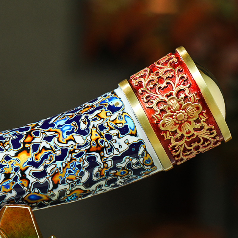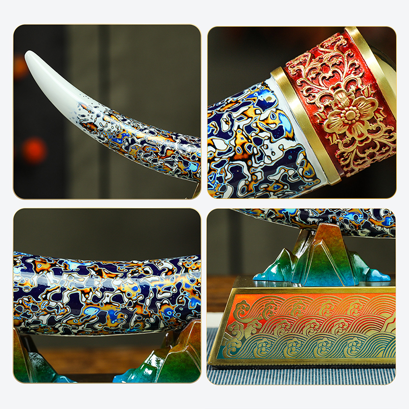 Crafted from brass with lacquer art, this ornament features an ivory-shaped design with intricate patterns. In feng shui, "elephant" sounds homophonic to "auspicious" in Chinese, so it symbolizes good luck and wealth attraction. The brass material adds a sense of luxury and cultural depth, while the meticulous craftsmanship—from the detailed patterns to the mountain-shaped base—reflects artistic excellence.