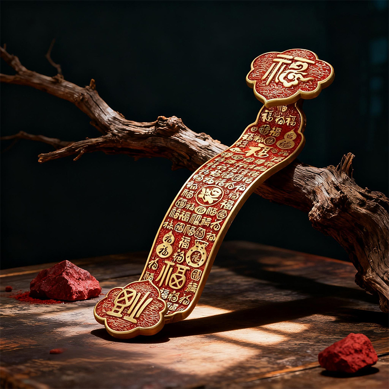 Crafted from brass, this Hundred Blessings Ruyi ornament—measuring approximately 12.99 * 3.15 * 5.31 inches—is embellished with numerous "blessing" characters, carrying auspicious meanings of good fortune and happiness. It incorporates cinnabar, a precious material, enhancing the product's value. With its exquisite craftsmanship and traditional design, it serves as a perfect decor piece. Also, it makes an ideal gift for occasions like housewarming, symbolizing best wishes.
