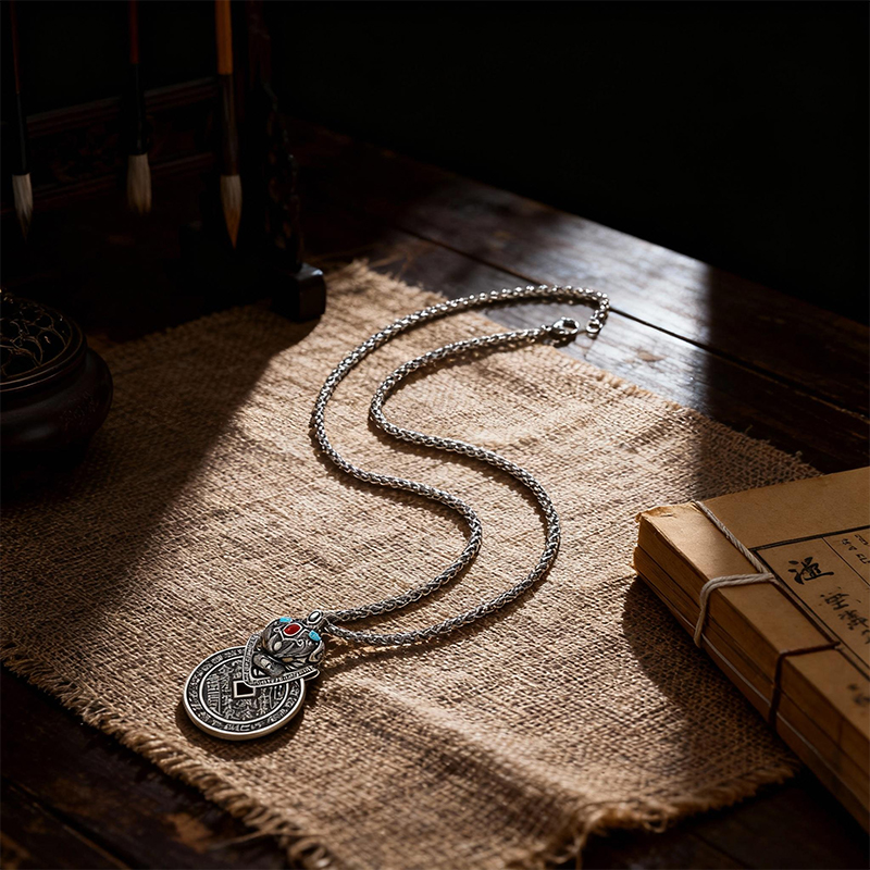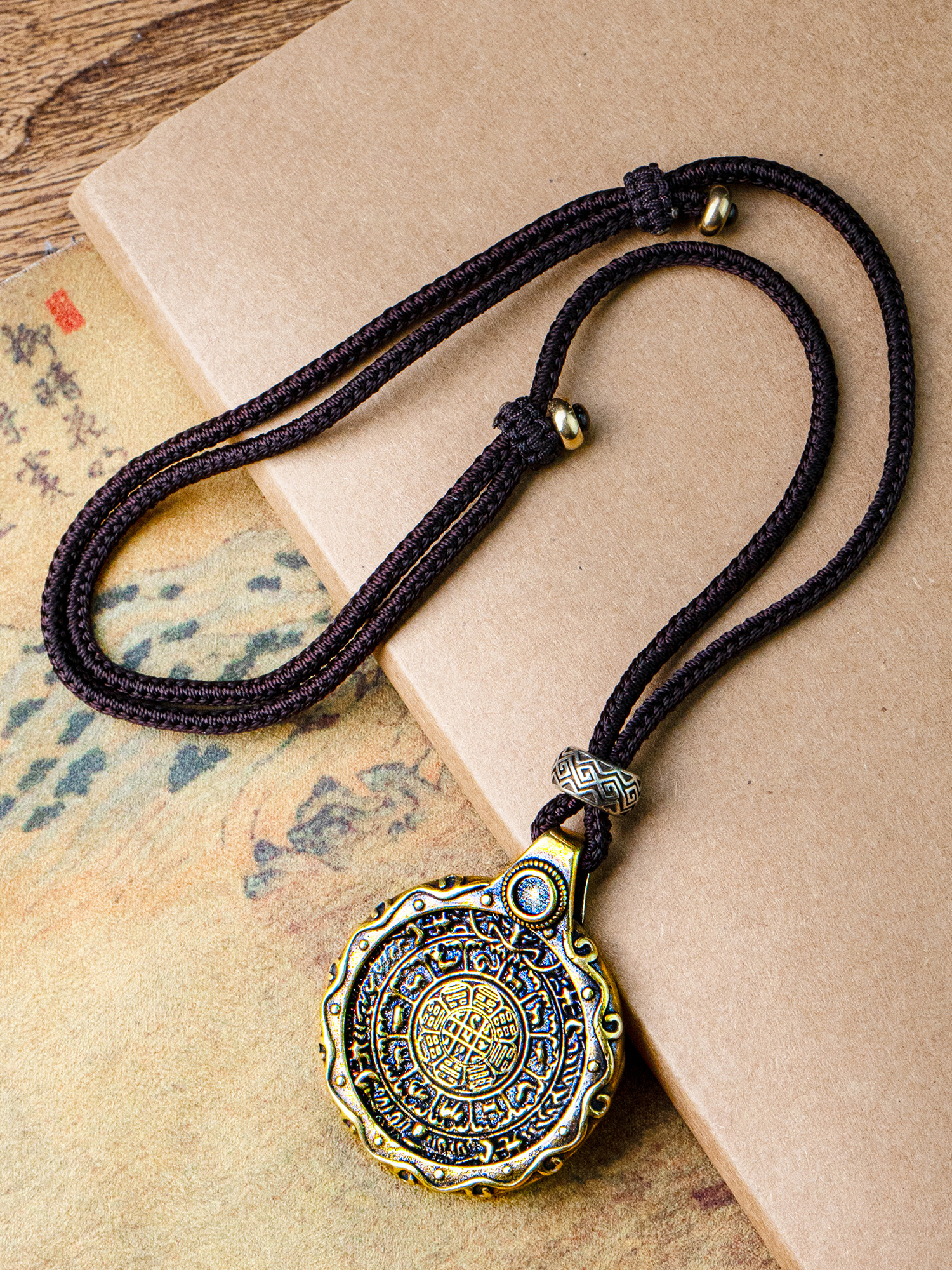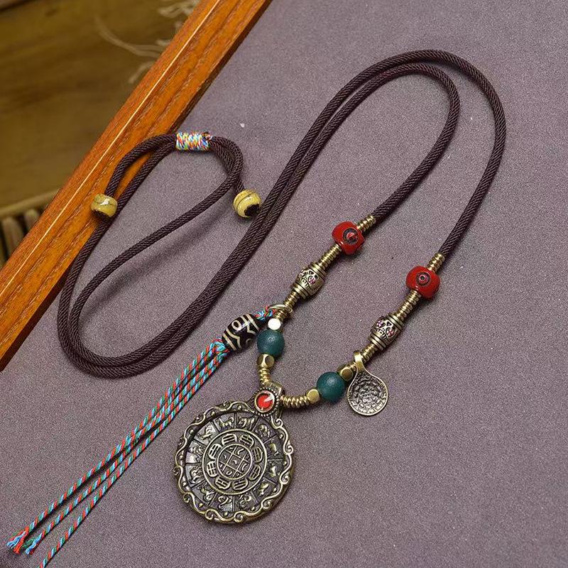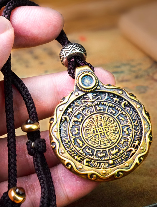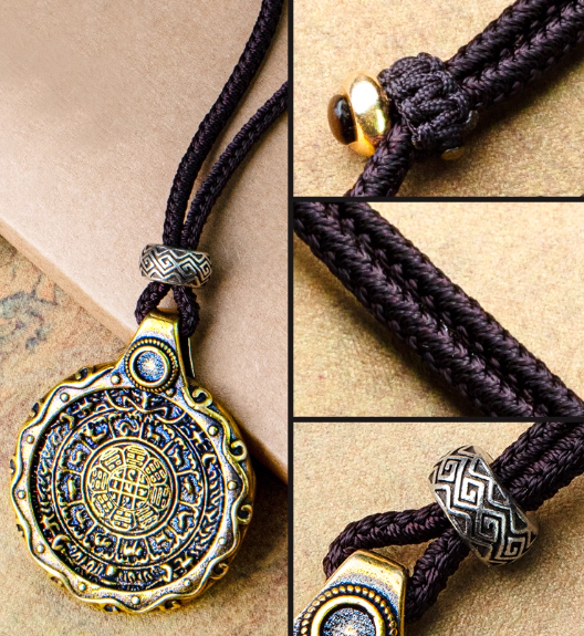 This piece showcases a brass pendant featuring the Nine – Palace Eight – Trigrams design, paired with a hand – woven cord. The Nine – Palace Eight – Trigrams is a vital symbol in feng shui, representing the harmonious order of the universe. It's believed to bring balance, ward off negative energies, and attract good fortune. The brass material gives the pendant a substantial feel and a lustrous appearance that ages beautifully. The hand – woven cord adds an artisanal touch, complementing the pendant's cultural significance. Every detail, from the intricate engravings on the pendant to the craftsmanship of the cord, reflects a dedication to quality and cultural heritage, making it a meaningful accessory for those who value traditional wisdom and spiritual well – being.