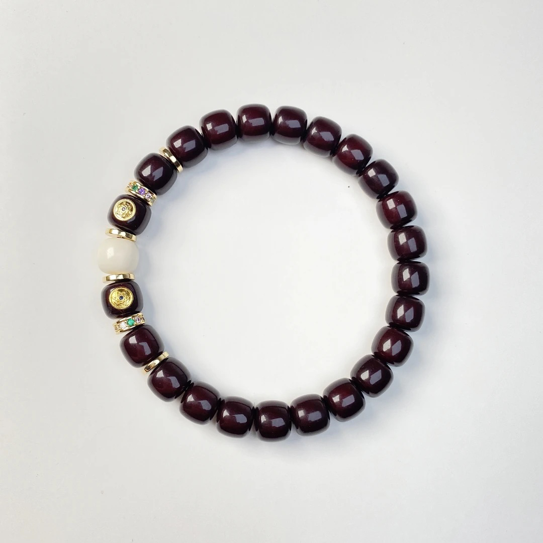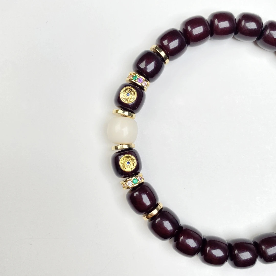 Crafted with burgundy bodhi beads and embellished with golden accents, each element of this bracelet carries profound cultural and spiritual meanings. The deep burgundy hue of the bodhi beads symbolizes wisdom, maturity, and the richness of one’s spiritual journey, while the golden elements represent prosperity, protection, and the illumination of enlightenment. The pendants embody wishes for abundance, inner peace, and the courage to navigate life’s path with clarity. Bodhi beads, revered in traditional spiritual traditions, are closely associated with enlightenment, mindfulness, and the awakening of consciousness.