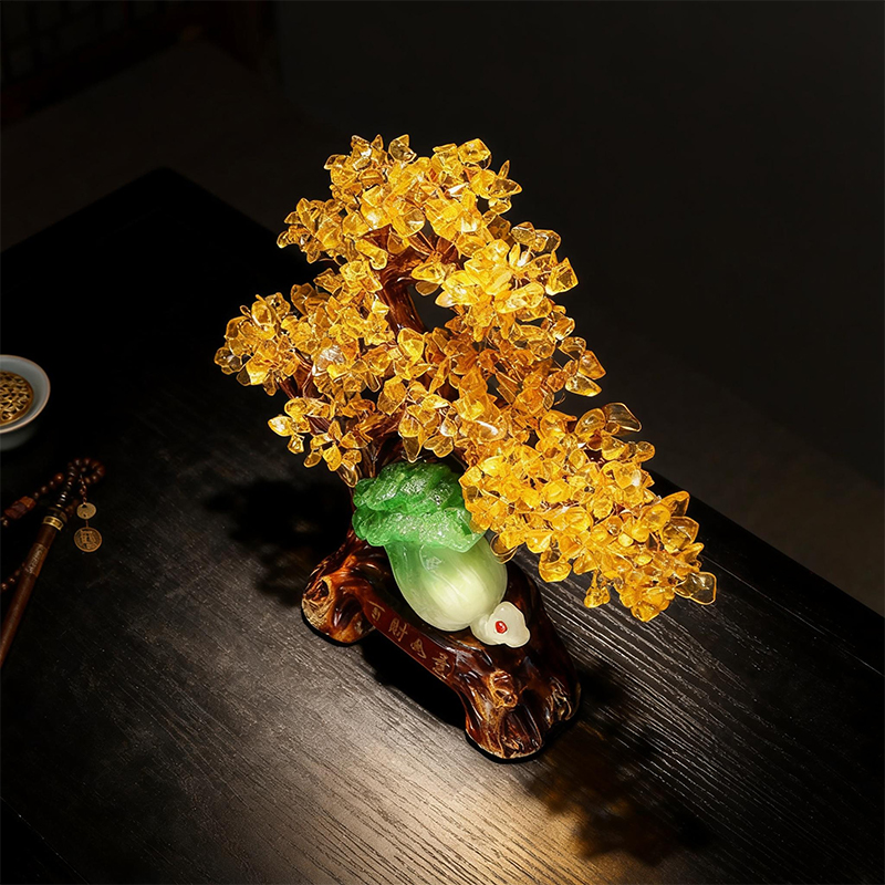 This ornament features a money tree made of citrine crystals, accompanied by a Chinese cabbage. In Chinese culture, citrine symbolizes wealth and prosperity, while the cabbage, with its name sounding like "hundreds of fortunes", represents the gathering of wealth. Measuring 14.96 * 4.72 * 12.20 inches, the intricate craftsmanship and vivid colors make it not only a visually appealing decorative piece but also a powerful symbol of good fortune and abundance.