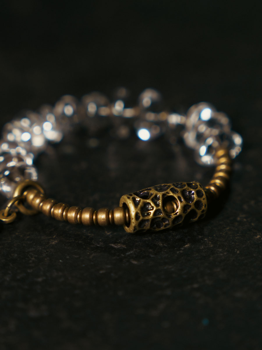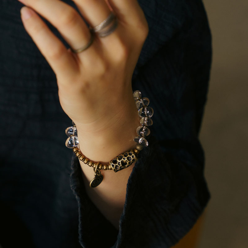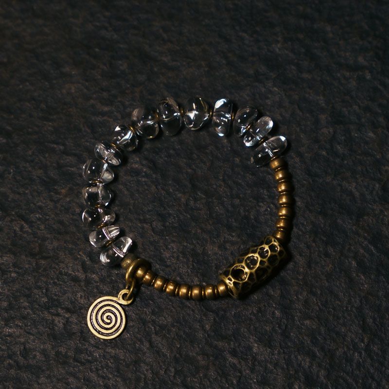 This bracelet features clear quartz beads paired with vintage-style metal components. Clear quartz is renowned as a "master healer" in crystal lore, believed to amplify energy, enhance clarity of thought, and promote spiritual growth. The unique, irregular shape of each quartz bead showcases its natural beauty, while the metal elements add a touch of retro charm. Meticulously crafted, each bead is selected for its transparency and quality, then strung to create a harmonious piece. It carries connotations of mental clarity, energy amplification, and spiritual enlightenment.