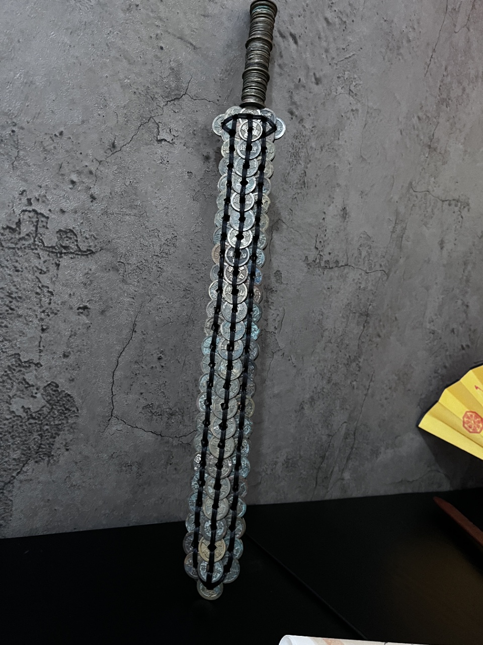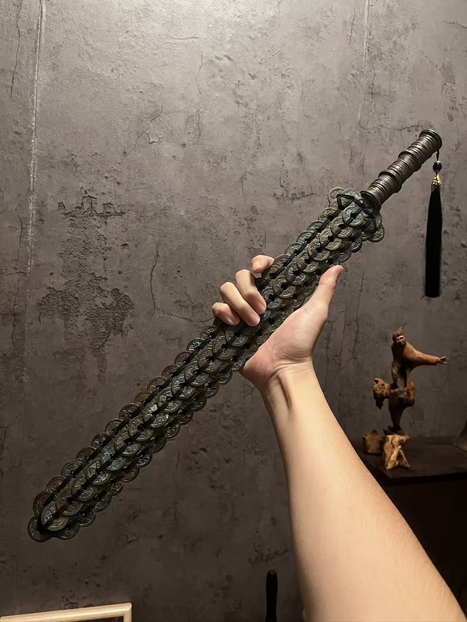 In terms of specifications, it is made by weaving about 240 ancient copper coins, with an overall length of approximately 24 inches and a total weight of around 3.09 pounds. Craftsmen ingeniously form the copper coins into a sword shape. Copper coins inherently have the philosophical connotation of "the sky is round and the earth is square" and are endowed with the beautiful expectations of attracting wealth and warding off evil. The sword is a symbol of protecting the house and dispelling evil in folk customs. The integration of the two makes this copper coin sword a folk treasure with dual meanings of "attracting blessings and wealth" and "suppressing evil and transforming misfortune".