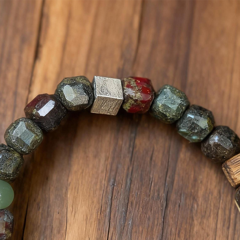 This bracelet is crafted with dragon blood stone beads, wood beads, and Hetian jade, featuring a harmonious blend of earthy tones and natural textures. Dragon blood stone is believed to carry nurturing energy, promoting emotional balance and joy. The wood bead adds a touch of organic warmth and energy that grounds and centers, while Hetian jade symbolizes good fortune and fulfillment of wishes. The combination of these materials creates a meaningful accessory that integrates natural beauty, cultural significance, and spiritual symbolism.