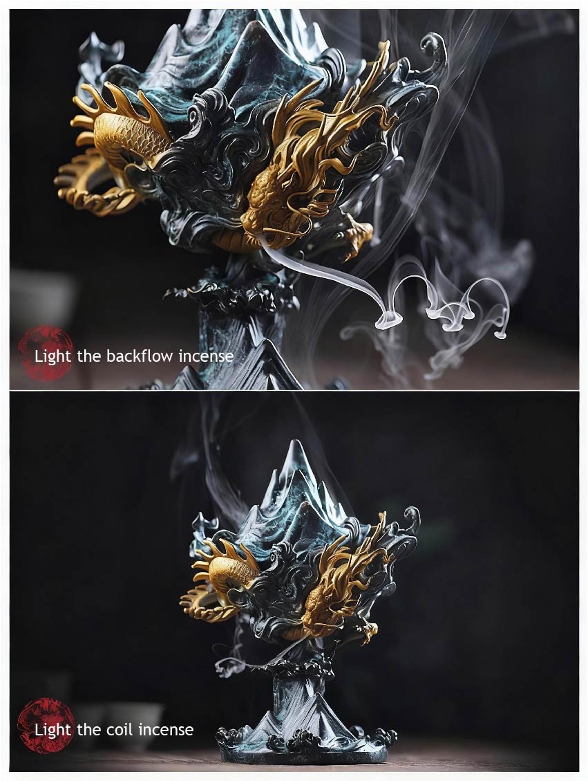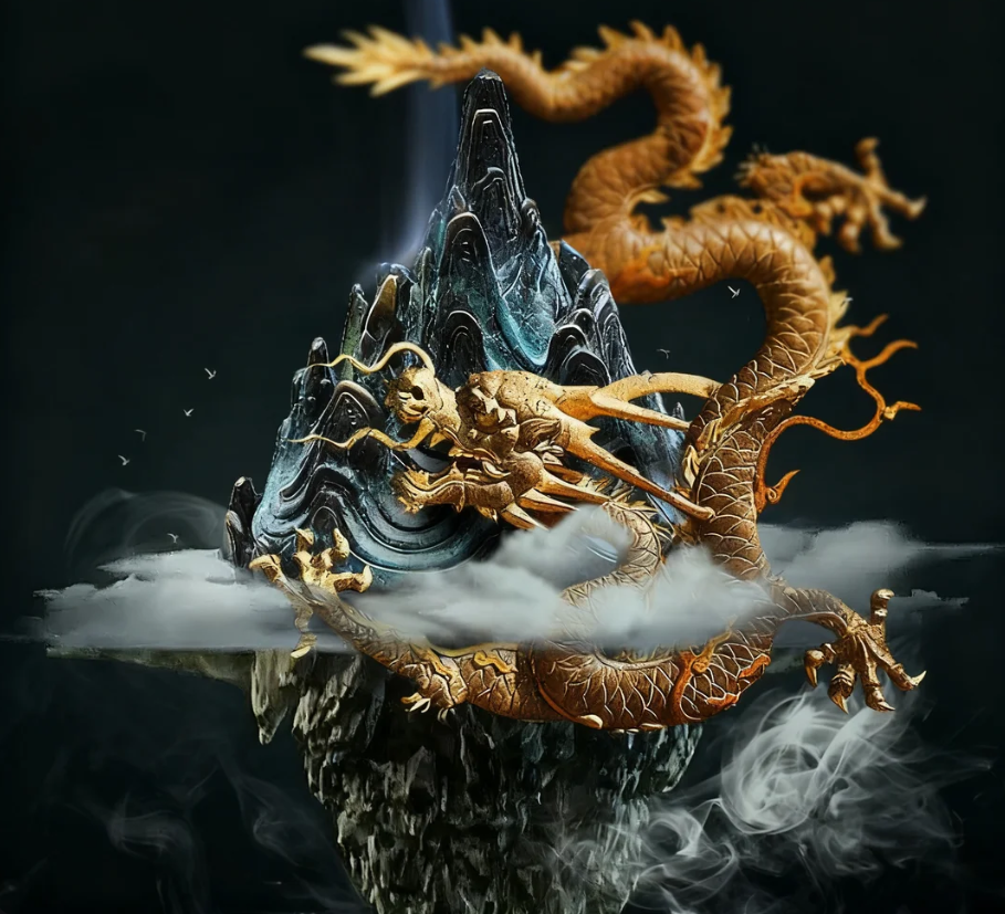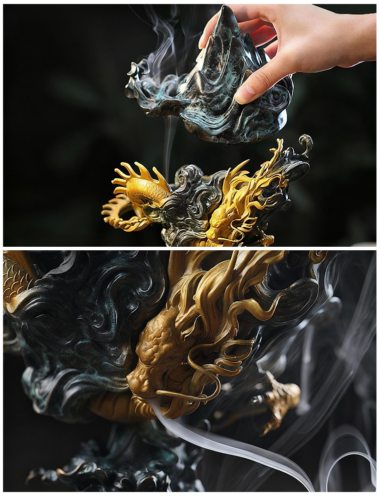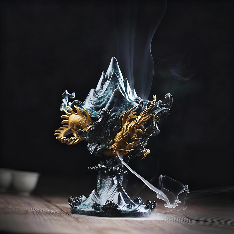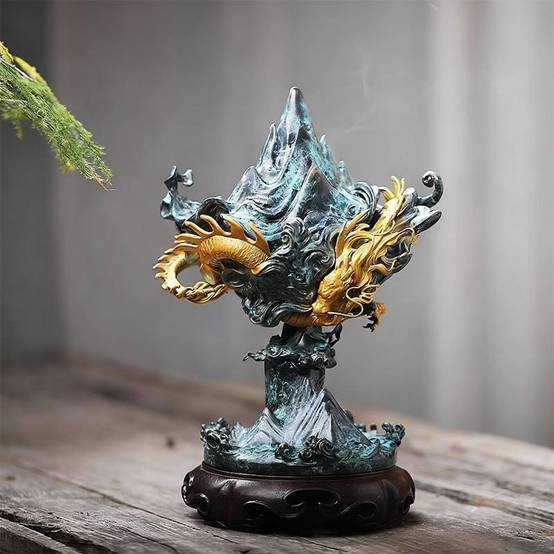 Crafted with intricate detailing, this incense burner features a golden dragon amidst mountain motifs. In feng shui, dragons symbolize power, success, and good fortune, attracting career advancements and prosperity. The mountain design represents stability and grandeur, creating a harmonious balance of energy. Meticulous craftsmanship, from the dragon’s scales to the mountain’s texture, reflects artistic excellence.