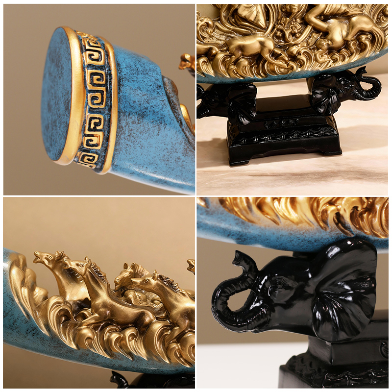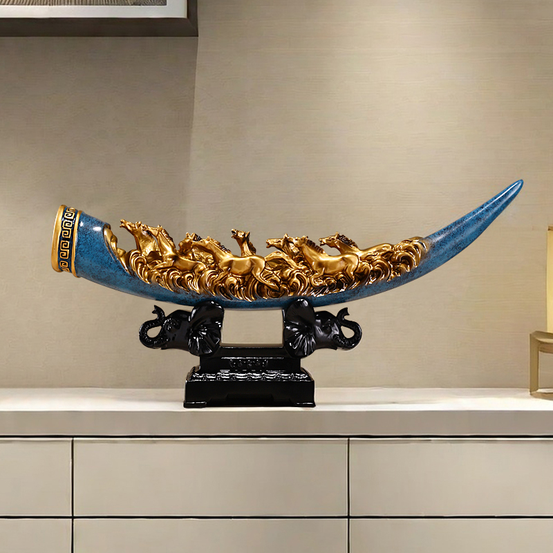 Crafted from resin, this ornament features a dynamic design of eight golden horses on an ivory-shaped base, supported by elephant motifs. In feng shui, horses symbolize "immediate success in career" and forward momentum, attracting career advancements and bold pursuits. Elephants represent stability and prosperity, ensuring a solid foundation for wealth and endeavors. The intricate craftsmanship—from the lifelike horse details to the stable elephant base—reflects meticulous artistry.