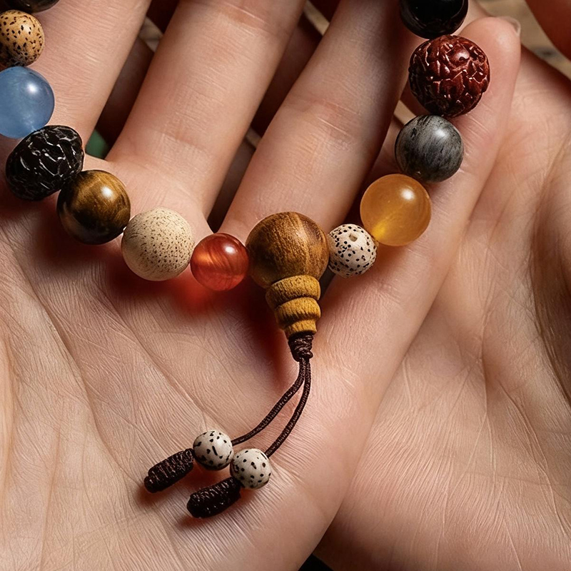 Featuring eighteen seeds of various bodhi, precious woods, and gemstones, this hand-strung bracelet is a fusion of traditional symbolism and artisanal craft. In cultural traditions, bodhi seeds embody spiritual enlightenment and wisdom, while the "eighteen seeds" represent the eighteen realms of perception, signifying a journey toward inner peace and clarity. Merging age-old beliefs with meticulous craftsmanship, it carries connotations of spiritual growth, cultural inheritance, and energetic harmony.