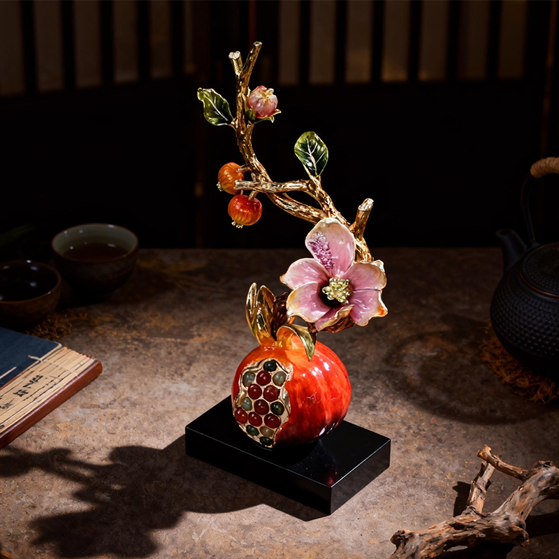 This pomegranate ornament is crafted with exquisite enamel craftsmanship. The vivid red pomegranate, adorned with detailed flowers and branches, is a symbol of fertility and prosperity in many cultures. It represents the wish for a large and happy family, as well as harmonious relationships. Measuring approximately 7.87 * 12.60 inches, with its brilliant colors and delicate design, it not only serves as a beautiful decorative piece but also carries profound cultural meanings, making it a valuable addition to any home.