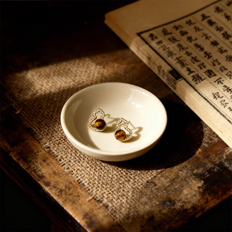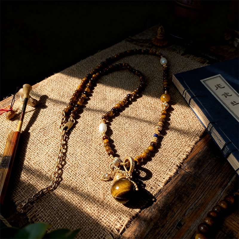 Crafted with tiger's eye beads, pearls, and metallic accents, this set embodies the symbolism of Earth in the Five Elements theory of traditional Chinese culture, representing stability, nourishment, and grounding energy. The tiger's eye stones, with their rich golden-brown hues and distinctive bands, are believed to enhance courage, confidence, and spiritual protection. The pearls add a touch of elegance, symbolizing purity and harmony, while the intricate metallic details reflect the craftsmanship rooted in cultural heritage. Together, these elements merge the Earth element's themes of steadfastness and abundance.