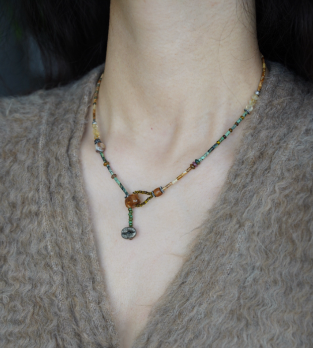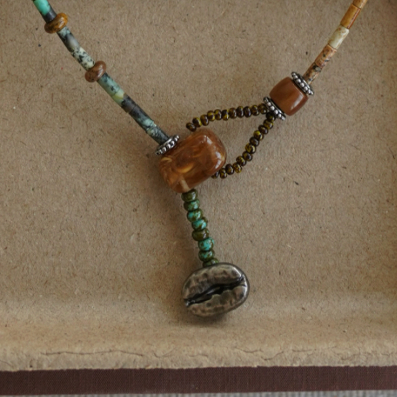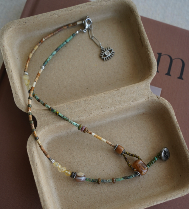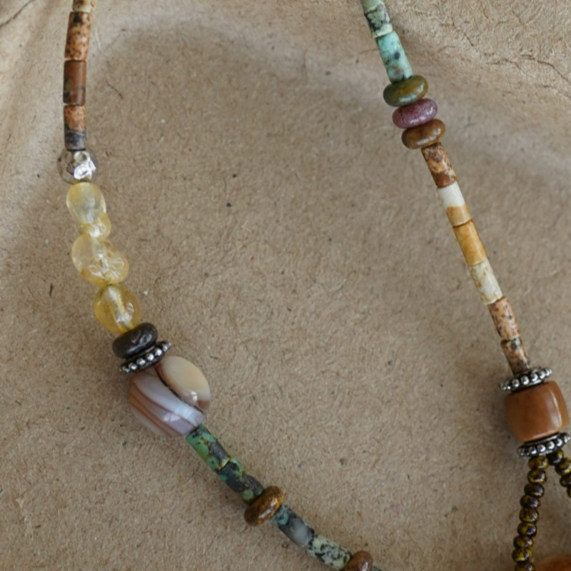 Featuring natural citrine, African turquoise, wood grain stone, and Czech beads, this hand-strung necklace merges spiritual symbolism with artisanal craft. In feng shui and crystal traditions, citrine is believed to attract abundance and positive energy, while turquoise symbolizes protection and clarity. Each bead, with its unique texture and color, is chosen for its energetic properties. It is an accessory carrying connotations of prosperity, spiritual protection, and energetic alignment, rooted in traditional beliefs and modern design.
