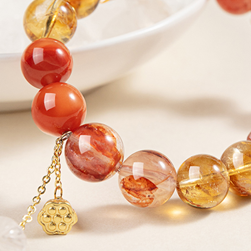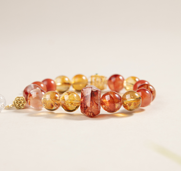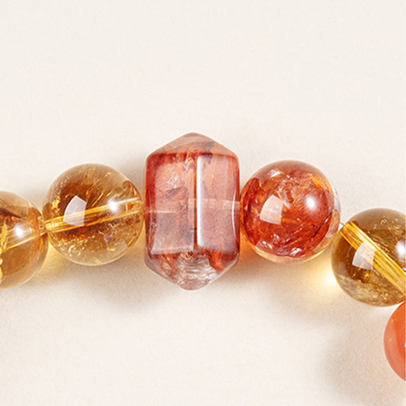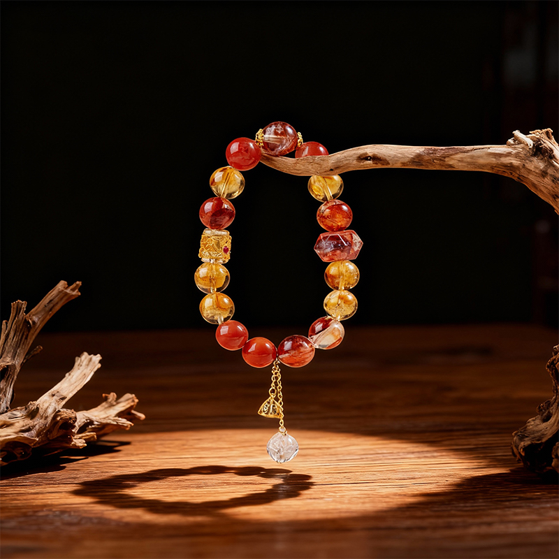 Crafted with red fireworks quartz, white crystal, south red agate, and citrine, this bracelet features vibrant red, clear, and golden hues. In Eastern metaphysics, it supports the fire element, symbolizing vitality, wisdom, and prosperity. Red fireworks quartz represents passion and good fortune, white crystal signifies purity and clarity, while south red agate embodies courage and harmony. It integrates natural crystals with Feng Shui symbolism, bringing the wearer blessings of energy balance, career breakthroughs, and spiritual enlightenment.