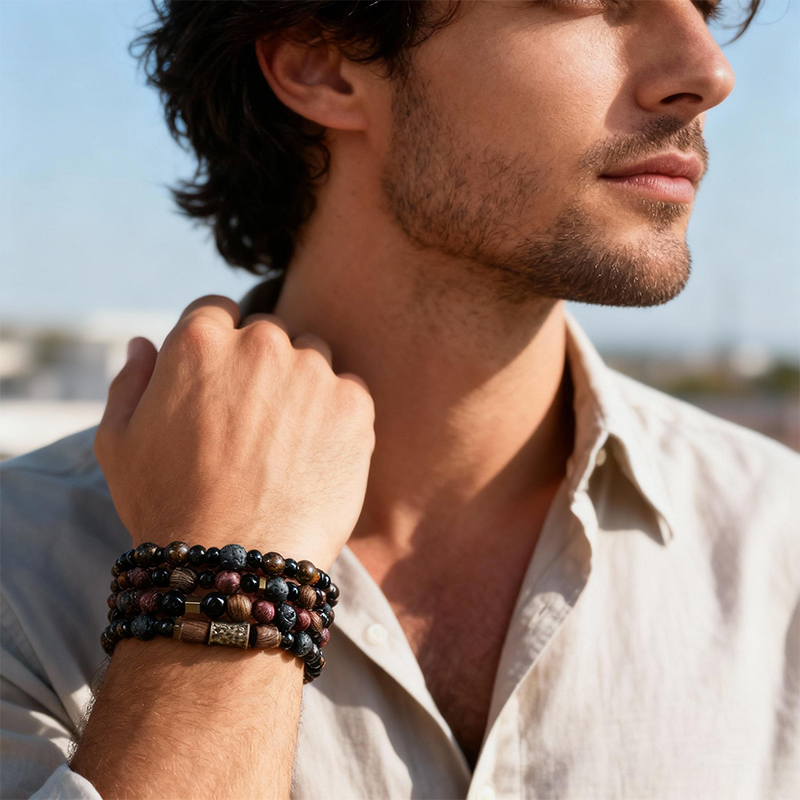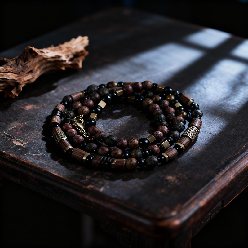 This bracelet features obsidian and volcanic stone beads, complemented by retro design details. Obsidian is renowned as a protective stone that absorbs negative energy, while volcanic stone is linked to strength and a grounding effect. The bracelet integrates these stones with wooden and metal components, resulting in a unique combination of textures and colors. Each bead is meticulously selected and strung, demonstrating superb craftsmanship. It carries the meanings of protection and stability.