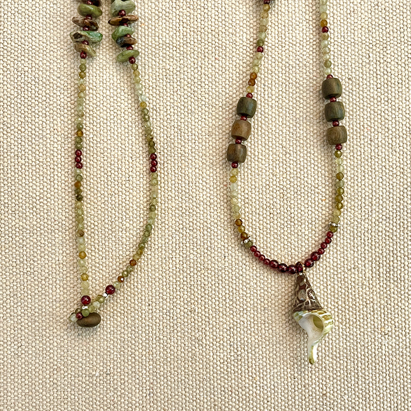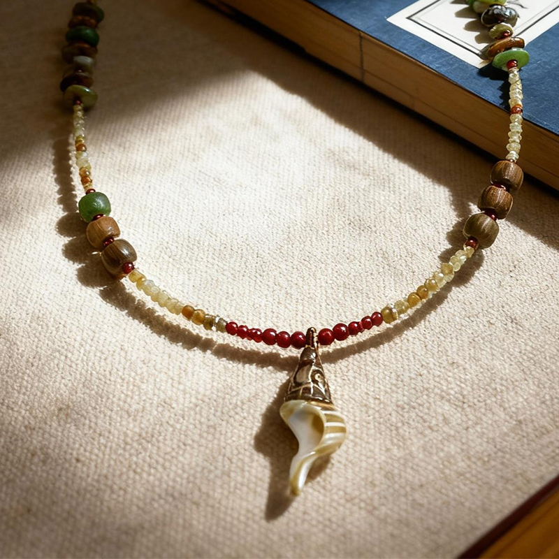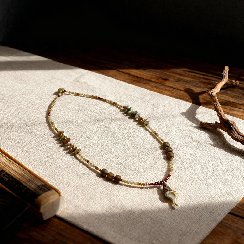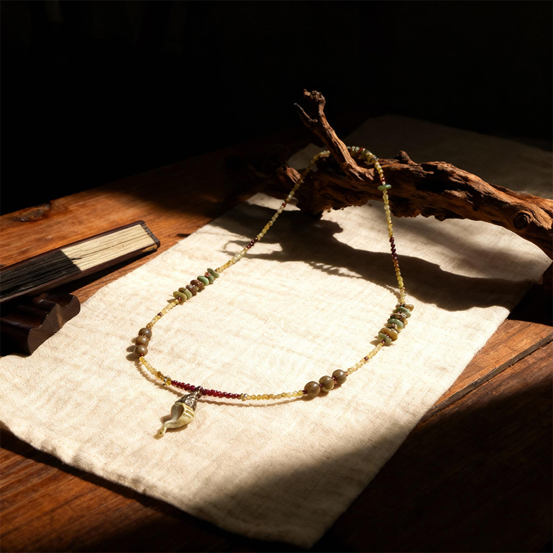 This necklace features a combination of shells, garnets, and green sandalwood beads. Garnet is known as a stone of vitality and protection, believed to enhance energy and ward off negative influences. Green sandalwood carries a calming and grounding energy, while the shell element adds a touch of natural coastal charm. Each component is carefully selected and strung together, showcasing the harmony of natural materials. It embodies the essence of nature, carrying connotations of vitality, stability, and a connection to the earth. It is normal for natural materials to have small defects such as impurities and uneven colors. The shell part is inlaid with a copper pendant, and the delicacy is limited. This is a handcrafted product, and handmaking takes time. Please think carefully before placing an order if you mind this.