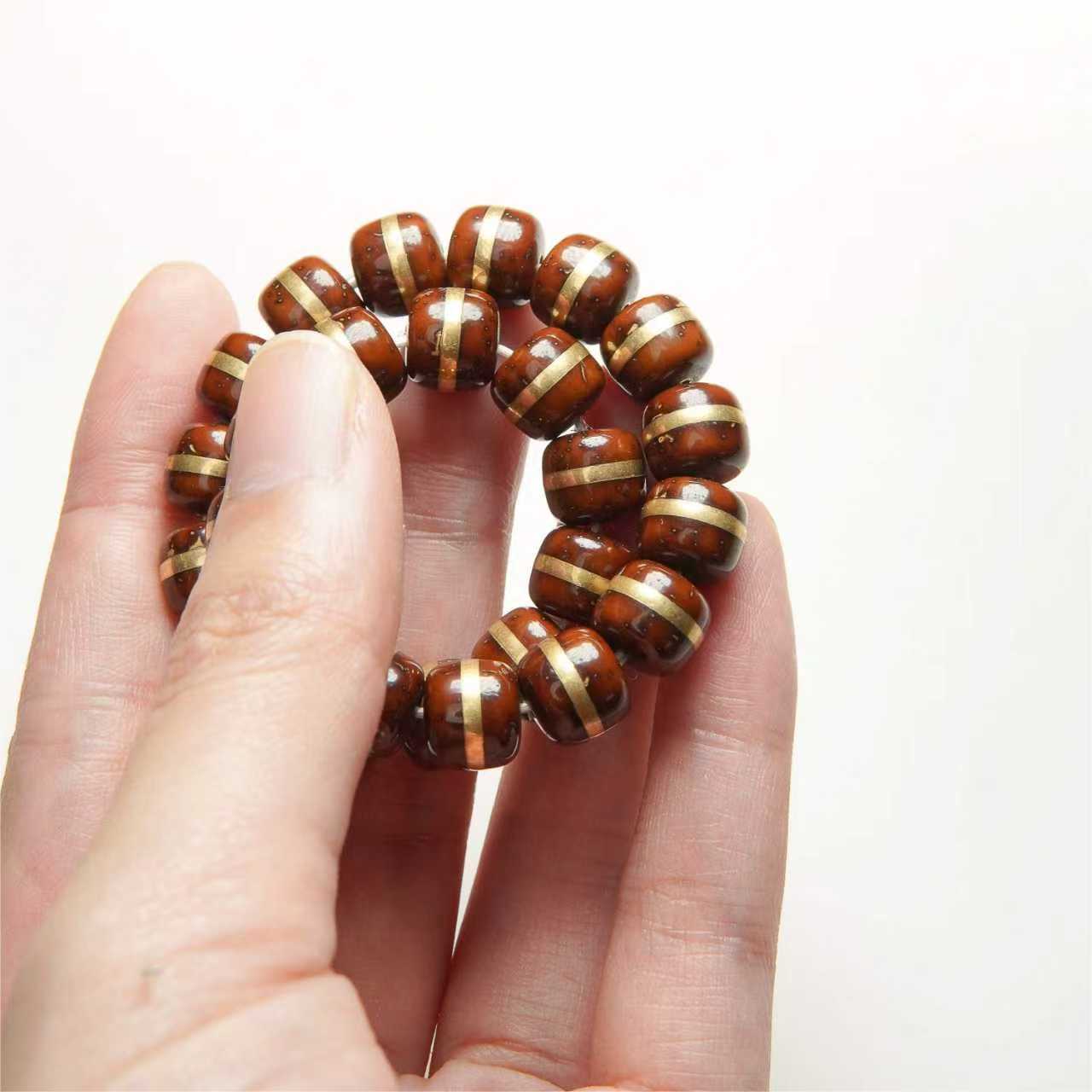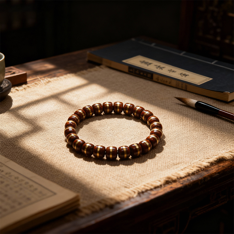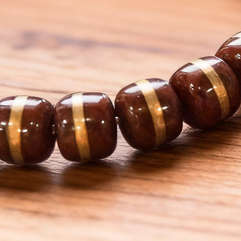 Crafted with purple gold rat bodhi seeds—the seeds of a palm tree—this bracelet features round, glossy brown beads with golden inlays. The purple gold rat bodhi symbolizes good fortune, prosperity, and wisdom in spiritual traditions. Its round shape represents wholeness and harmony, while the golden accents embody wealth and protection. It carries profound symbolism of abundance and inner peace.