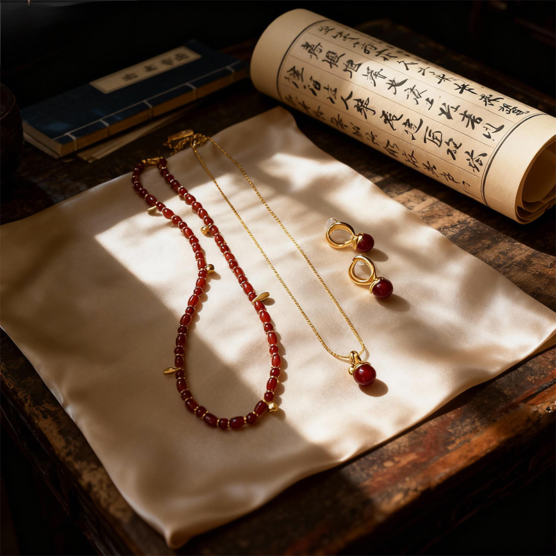 Crafted with red agate and gold-toned accents, this set includes a layered necklace and earrings, embodying the symbolism of Fire in the Five Elements theory—representing passion, vitality, and prosperity. Red agate, a fiery gemstone, is believed to enhance energy flow and emotional warmth, while gold elements symbolize abundance and nobility. The elegant design merges traditional elemental symbolism with contemporary aesthetics, carrying the essence of Fire energy and cultural heritage.