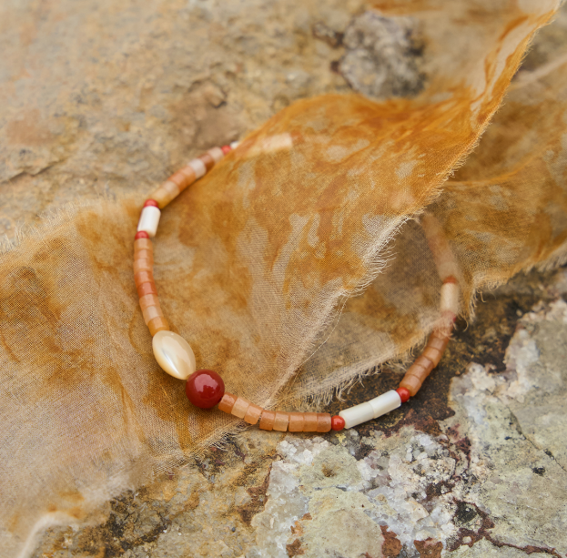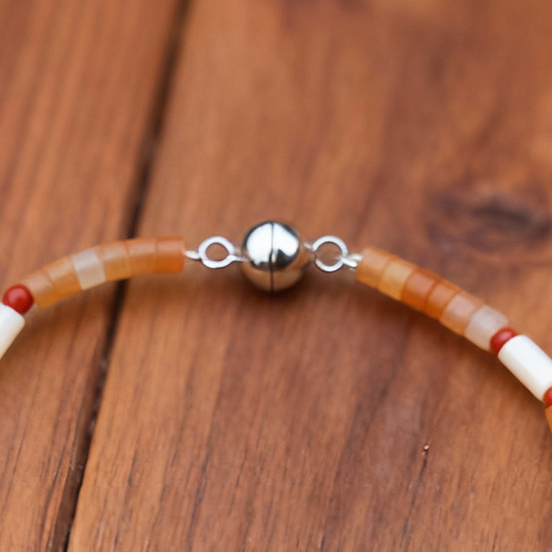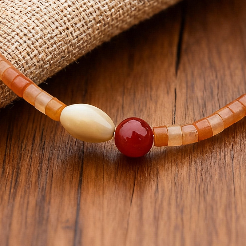 Material: Mother-of-Pearl, Nan Hong Agate Bead, Horse Hoof Shell, Red Agate, Orange Dongling Jade