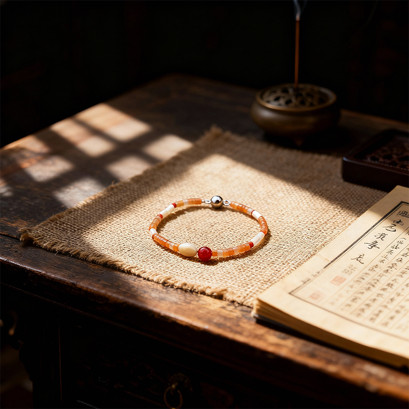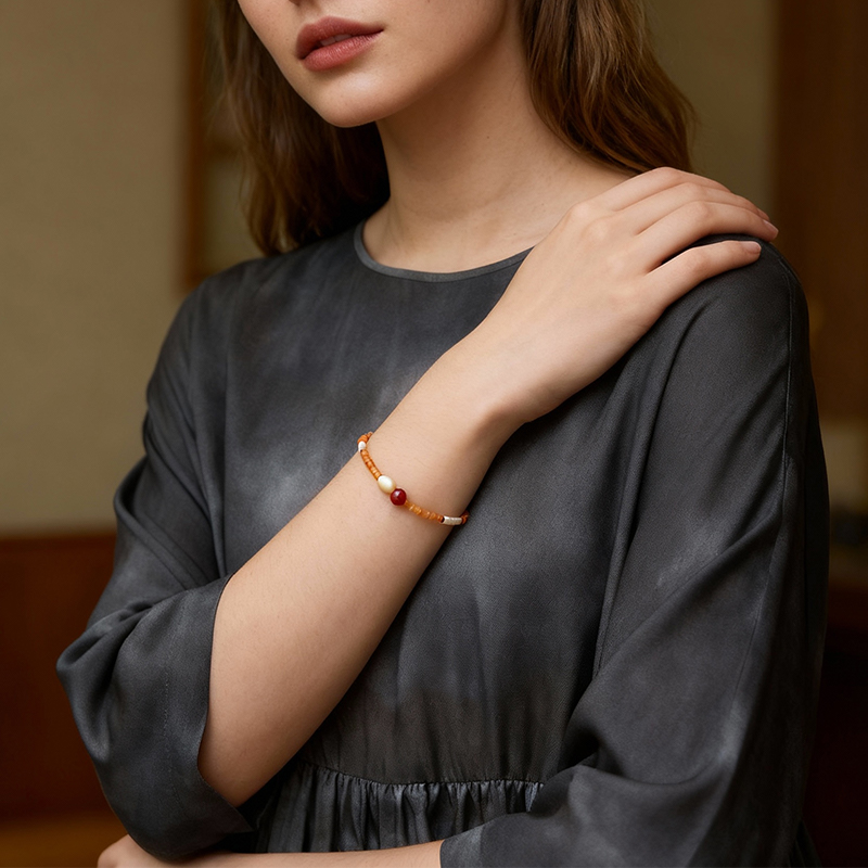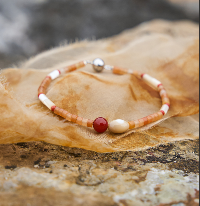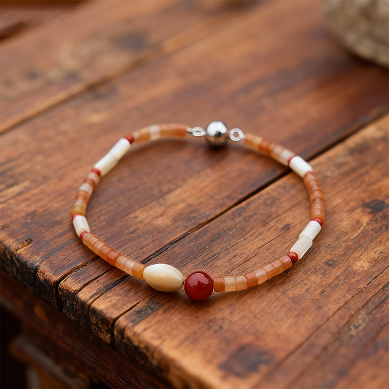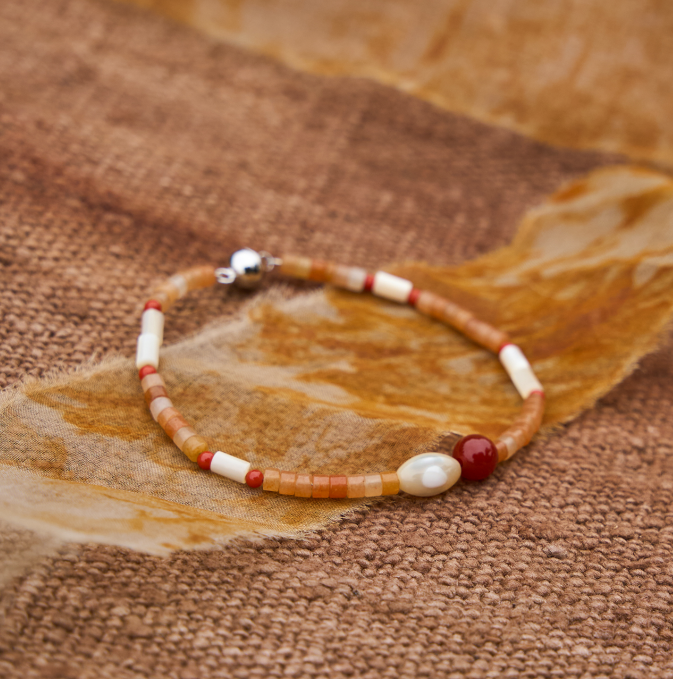 Crafted with red aventurine, south red agate, and mother-of-pearl beads, this bracelet features warm red and creamy hues. Red aventurine, a stone of prosperity, channels celestial energies to manifest wealth and abundance, infusing life with vibrant vitality. South red agate, revered as a guardian of courage, wraps the wearer in a shield, warding off negativity and empowering one with unwavering strength. Mother-of-pearl, a gift from the depths of the sea, brings a nurturing calm, balancing energies and inviting spiritual clarity. United, these treasures offer the wearer a blessed journey of abundant prosperity, fearless strength, and protection.