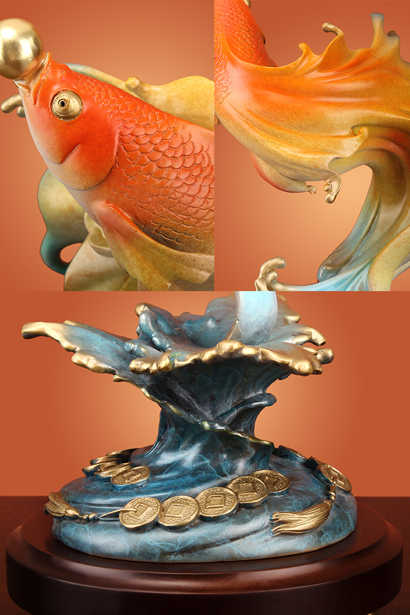 Crafted from high-quality brass, this ornament features a dynamic goldfish design with vibrant hues and intricate details. In feng shui, fish symbolize "abundant wealth and surplus year after year", attracting financial prosperity and good luck. The brass material adds a sense of luxury and cultural significance, while the lifelike craftsmanship—from the fish’s scales to the wave-shaped base—reflects artistic excellence.