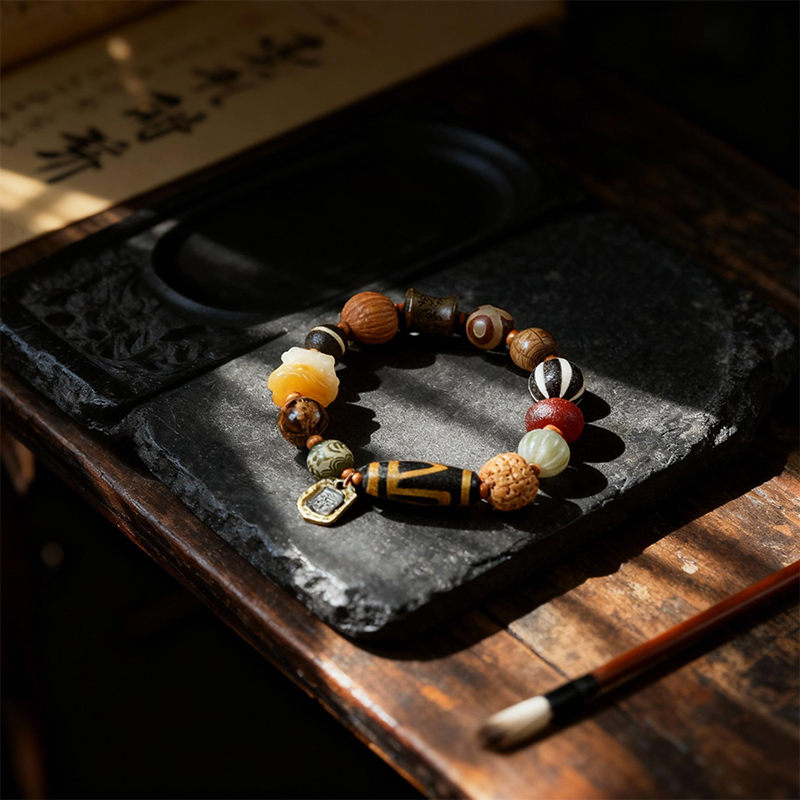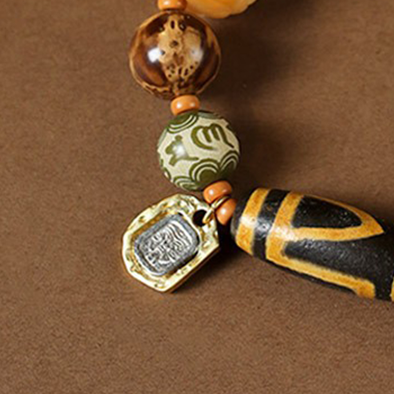 Crafted with a blend of bodhi seeds, dzi beads, and carved lion beads, this Tibetan-style bracelet showcases diverse natural materials and intricate craftsmanship. From carbonized bodhi to Tibetan dzi and the exquisitely carved lion bead, each element carries symbolic meanings of protection, wisdom, and auspiciousness. This is a bracelet born from the diverse fusion of materials and symbols rooted in Tibetan tradition, merging nature and culture into one unique piece.