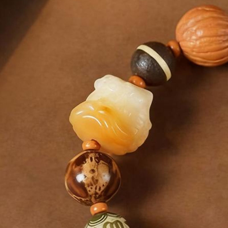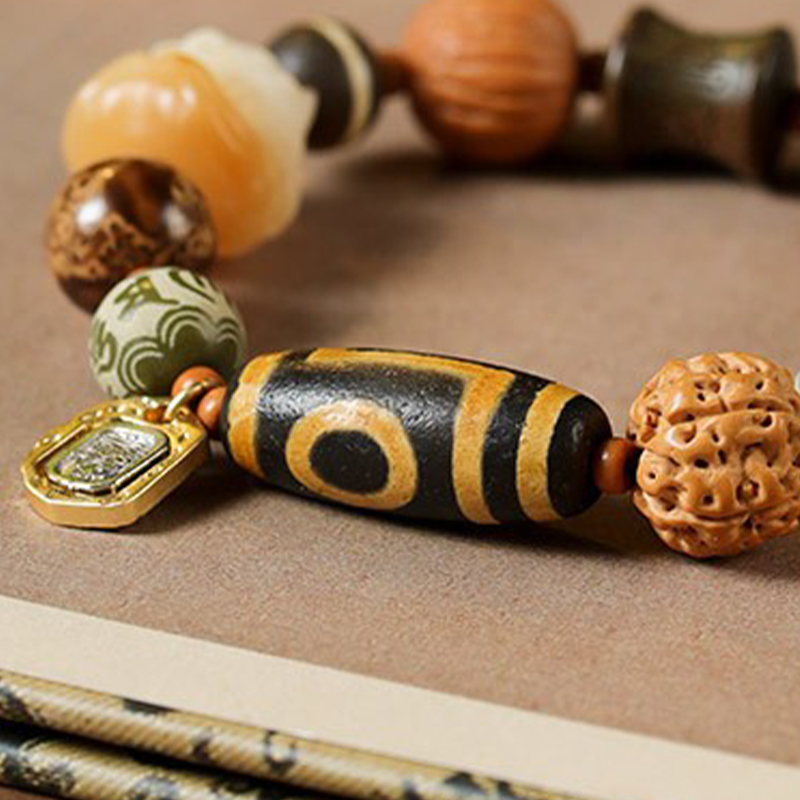 Material: Charred Bodhi, Green Sandalwood, Tibetan Dzi Bead, Vajra Bodhi, Monkey Head Walnut, Natural Stone