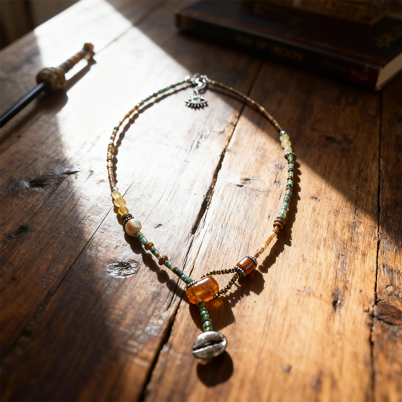 This necklace features tiger's eye stones and a gourd-shaped pendant. In feng shui, tiger's eye stone is considered to possess the energy of courage and protection, helping to dispel negative vibes. The gourd shape symbolizes good fortune and abundance as "gourd" has a similar pronunciation to "blessing" and "prosperity" in traditional culture. Meticulously crafted, each bead and the pendant are integrated harmoniously, making it not just an adornment but also a carrier of cultural meanings and spiritual blessings.
