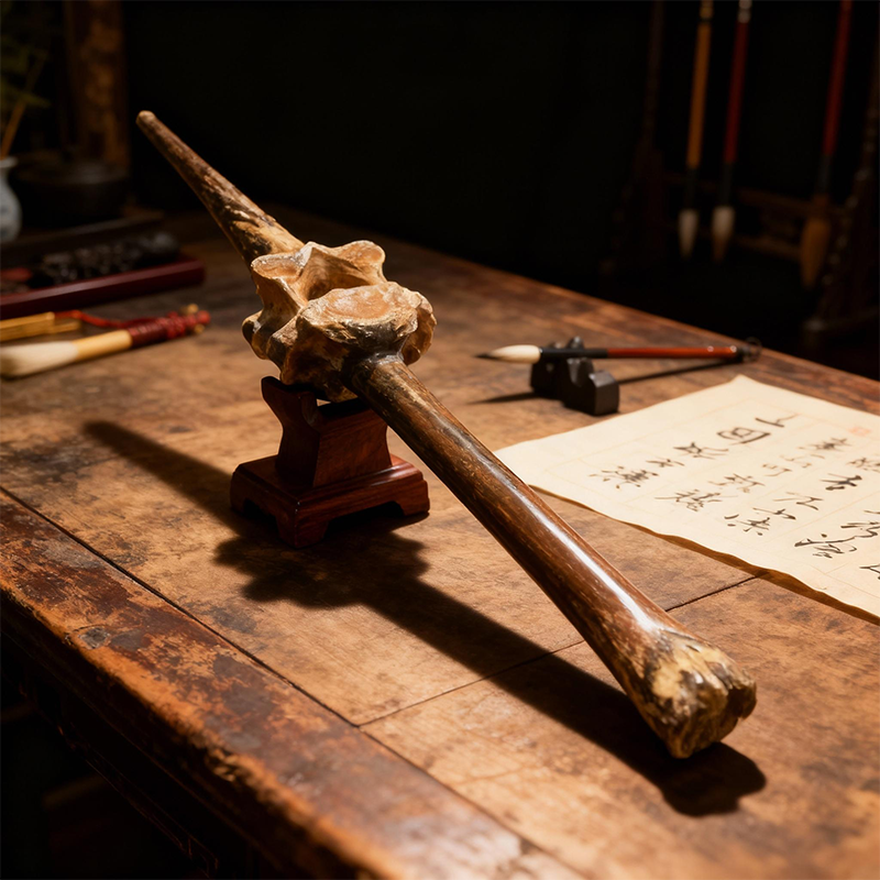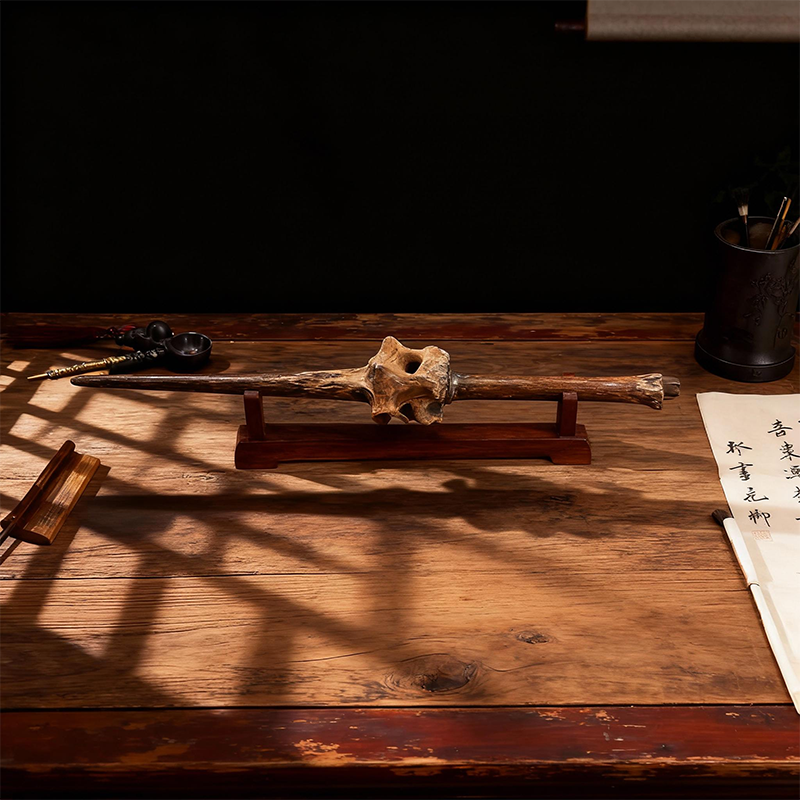 Crafted from rare bone with ingenuity, it is approximately 70 cm (nearly 28 inches) long and weighs 1300 grams (about 2.87 pounds), featuring a unique and dynamic shape. In the process of craftsmanship, the bone is endowed with the expression of ancient power and life texture. Its structure and texture presentation is not only the inheritance of traditional bone art techniques but also contains the creator's contemporary interpretation of the cultural concept of "conveying philosophy through utensils". Every detail of polishing seems to tell the dialogue between craftsmanship and culture, a unique carrier that integrates ancient craftsmanship spirit into the modern collection context.