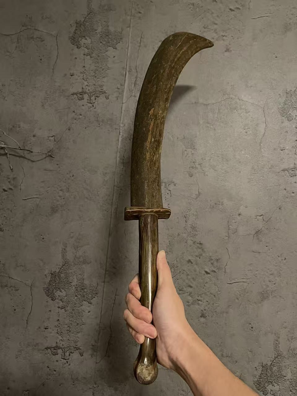 In terms of shape, it is crafted from a single piece of rare bone into a scimitar shape, measuring approximately 70 cm (nearly 28 inches) in length and weighing about 1550 grams (around 3.42 pounds). Bone itself contains the meanings of life continuation and power inheritance in ancient culture, while the scimitar shape was both a practical tool and a symbol of tribal authority and spiritual belief in ancient times. The combination of the two makes this bone scimitar a collectible masterpiece with dual values of "craftsmanship inheritance" and "cultural origin tracing".