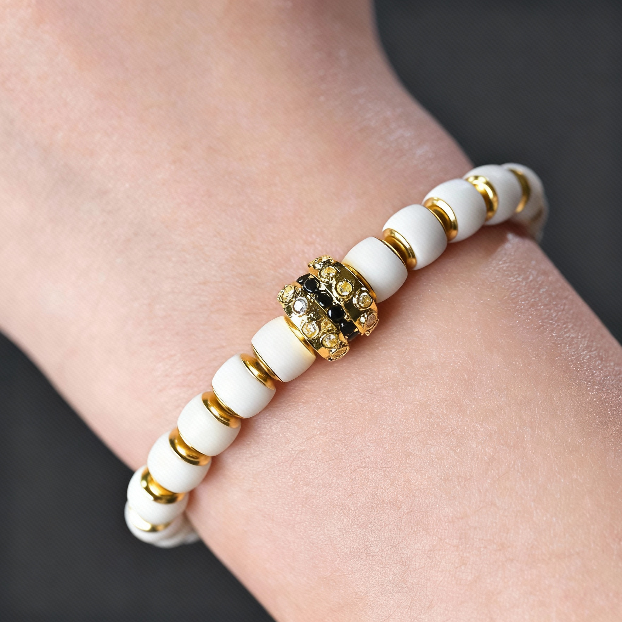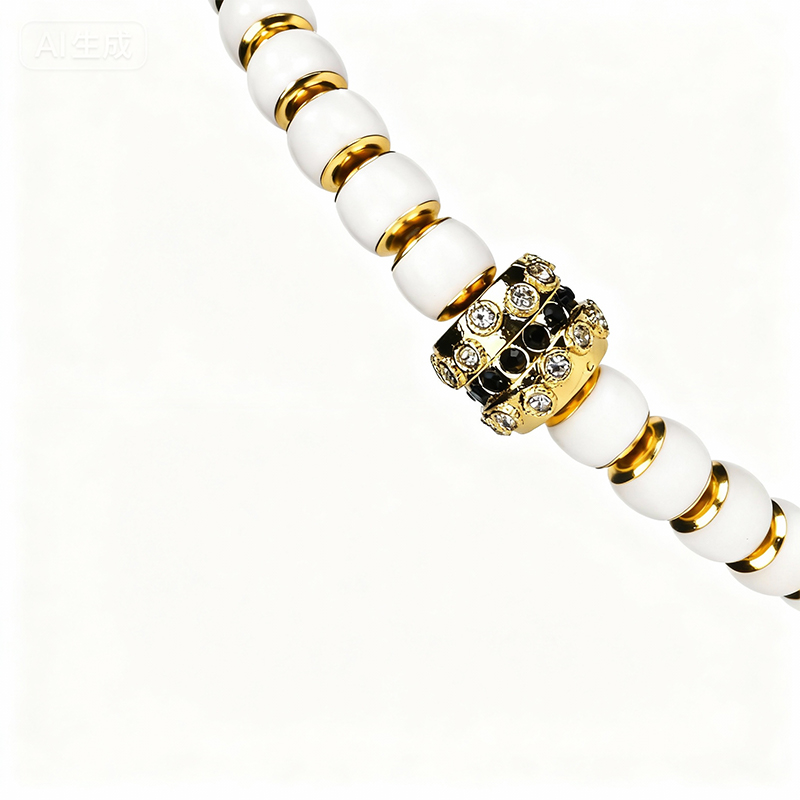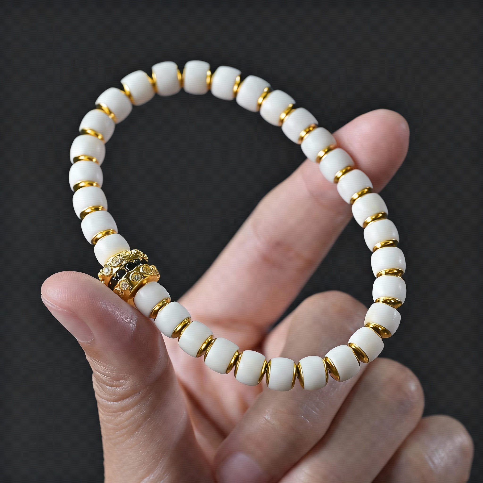 Crafted with white bodhi beads and adorned with golden accents and a detailed pendant, this bracelet embodies the symbolism of "a promising future" in cultural context. Bodhi beads are valued in spiritual traditions for their association with enlightenment and growth. The golden elements add a touch of elegance while enhancing the symbolic meaning of prosperity and good fortune. This piece integrates traditional craftsmanship, cultural significance, and spiritual symbolism, making it a meaningful accessory for those who appreciate holistic symbolism and aesthetic value.