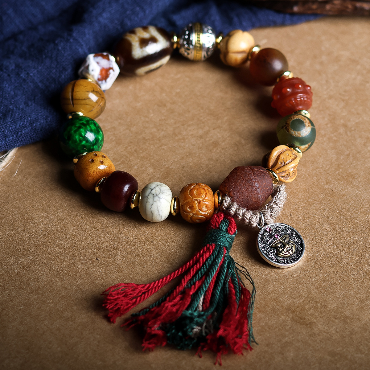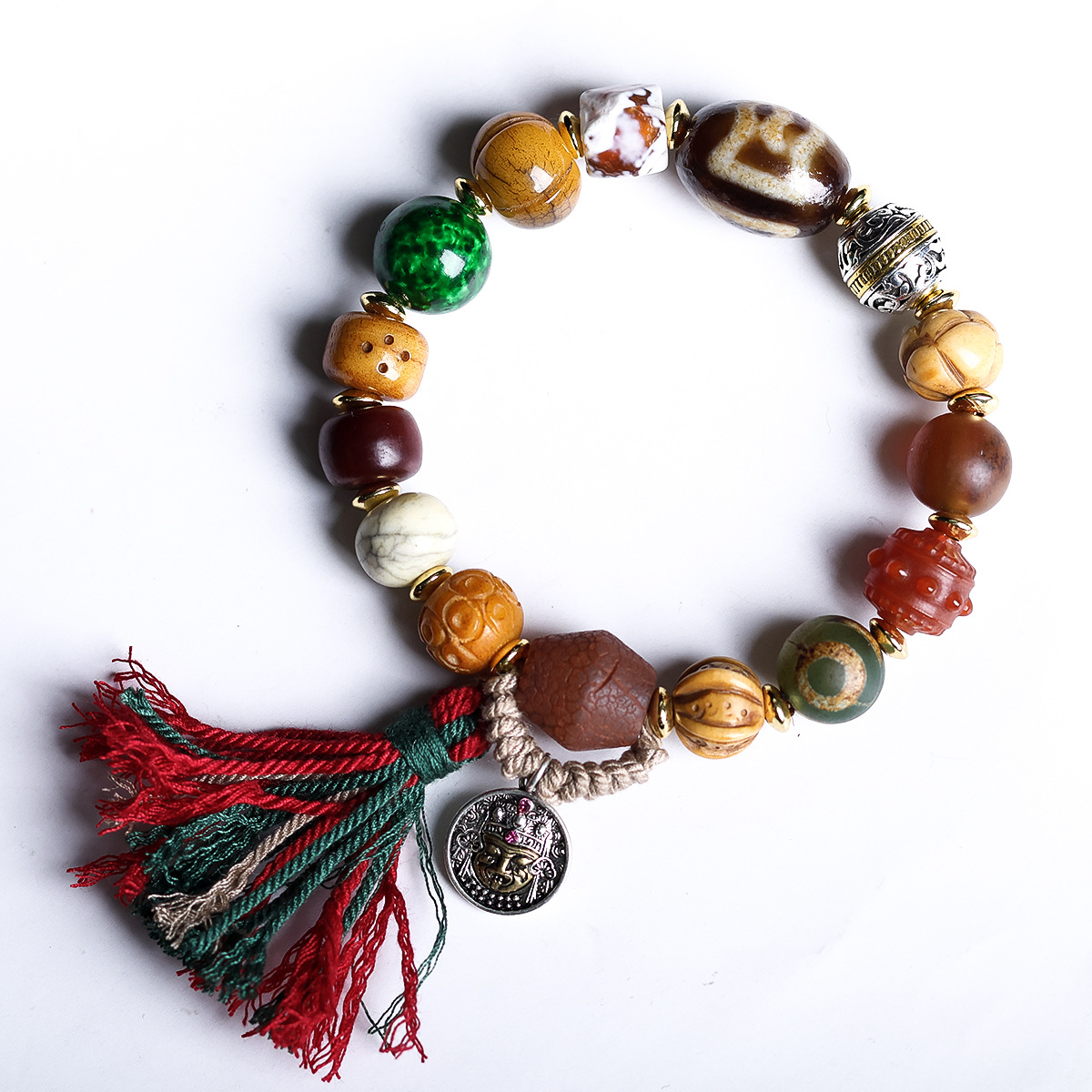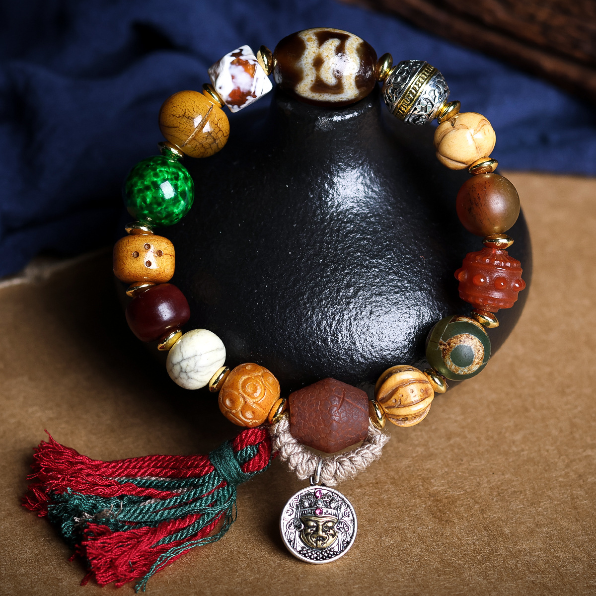 Made with yak bone beads, dzi bead, agate, and other natural materials, this bracelet features a variety of textures and colors, including the patterned dzi bead, carved agate, and polished yak bone. In Eastern spiritual traditions, such multi-treasure pieces symbolize harmony, the gathering of good fortune, and a link to cultural heritage. Each bead carries its own symbolic meaning, bringing the wearer blessings of peace, prosperity, and spiritual protection. As it’s made of yak bone, there might be a natural scent initially; it is recommended to place it in a well-ventilated area for 2 days to disperse the smell.